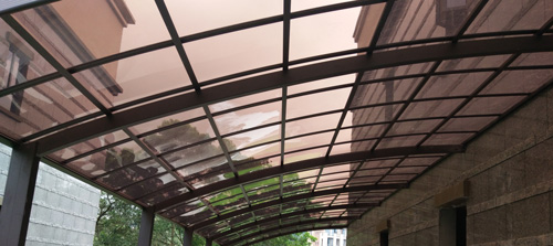 鋁合金停車(chē)棚頂棚采用進(jìn)口聚碳酸酯板,抗沖擊是玻璃的數(shù)百倍,有效防止高空墜物