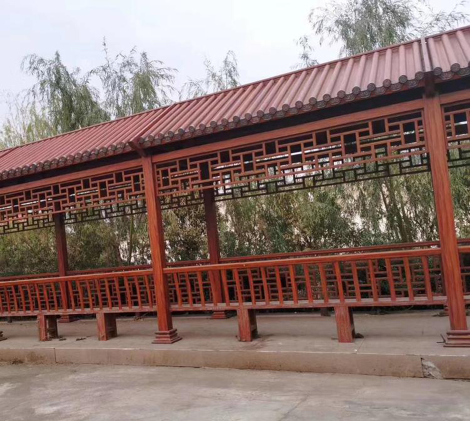 一面開敞,一面靠墻,墻上又設(shè)有各色漏窗門洞或設(shè)有宣傳櫥柜。