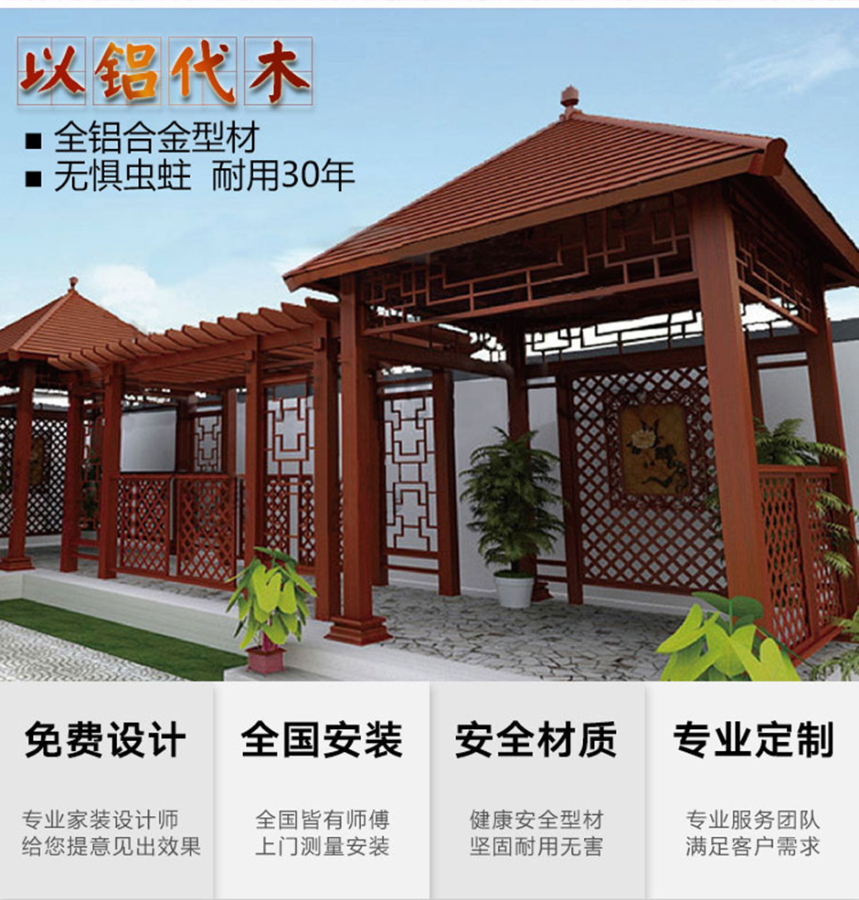 涼亭長(zhǎng)廊系列是演繹自然與生活的交融,創(chuàng)新的鋁合金框架加以表面木紋處理完美承襲生活所追求自然的經(jīng)典魅力,而它的設(shè)計(jì)靈魂正是根源于當(dāng)下所倡導(dǎo)的自然環(huán)保。此外,采用完美的建筑材料——水印氟碳木紋鋁型材,可在視覺上營(yíng)造出與自然對(duì)稱和諧之美,并具有耐候性、耐磨損、耐腐蝕性,硬度高、不易變形、仿木真圖案不褪色、不脫落等優(yōu)越特點(diǎn),呈現(xiàn)出自然與環(huán)保的平衡布局,成為經(jīng)久不衰的典雅風(fēng)格化身。