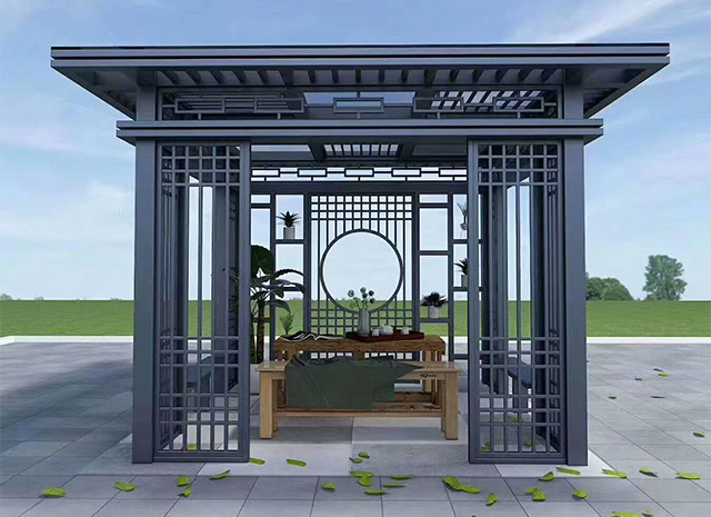 1、新中式鋁合金涼亭安裝簡單,施工便捷,不需要繁雜的施工工藝,節(jié)省安裝時間和費用。